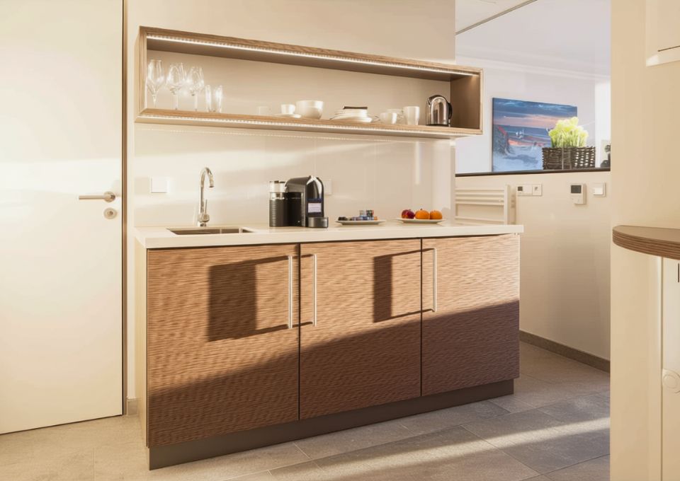 Appartement Juistblick 2 in der 2. Etage mit großzügiger Terrasse und Meerblick. Ausgestattet mit , Kabel-TV, Pantryküche (ohne Kochmöglichkeit) mit Nespresso Kaffeemaschine und Wasserkocher, Wohn-Schlafbereich mit Boxspringbetten, offener Dusche und separaten WC