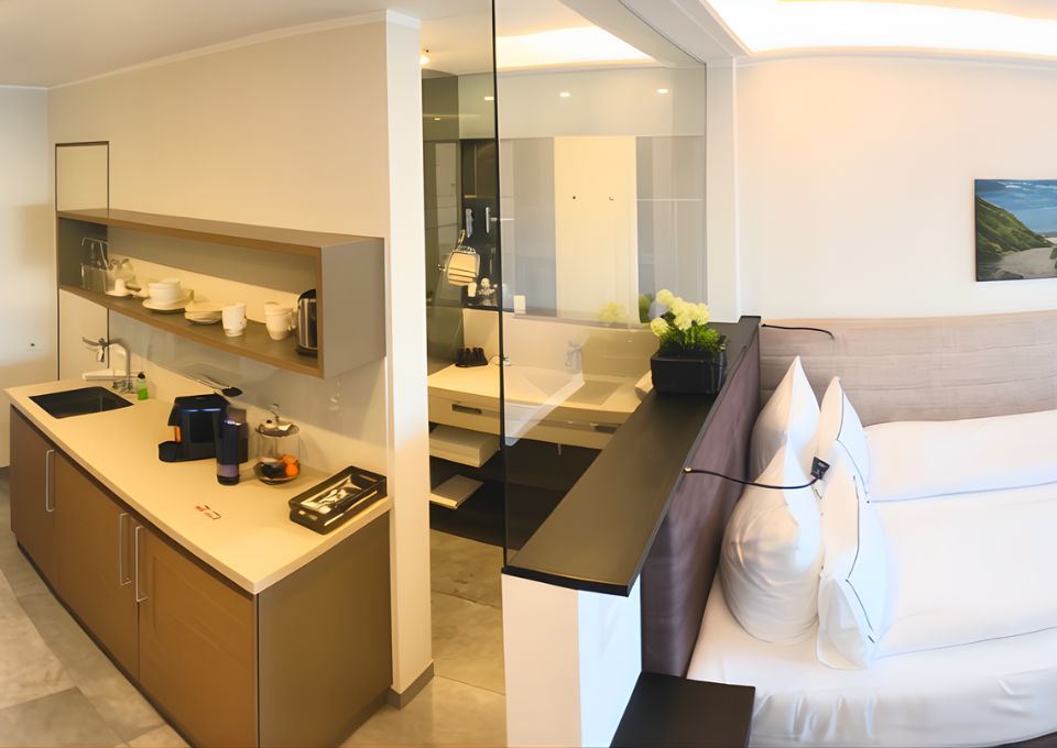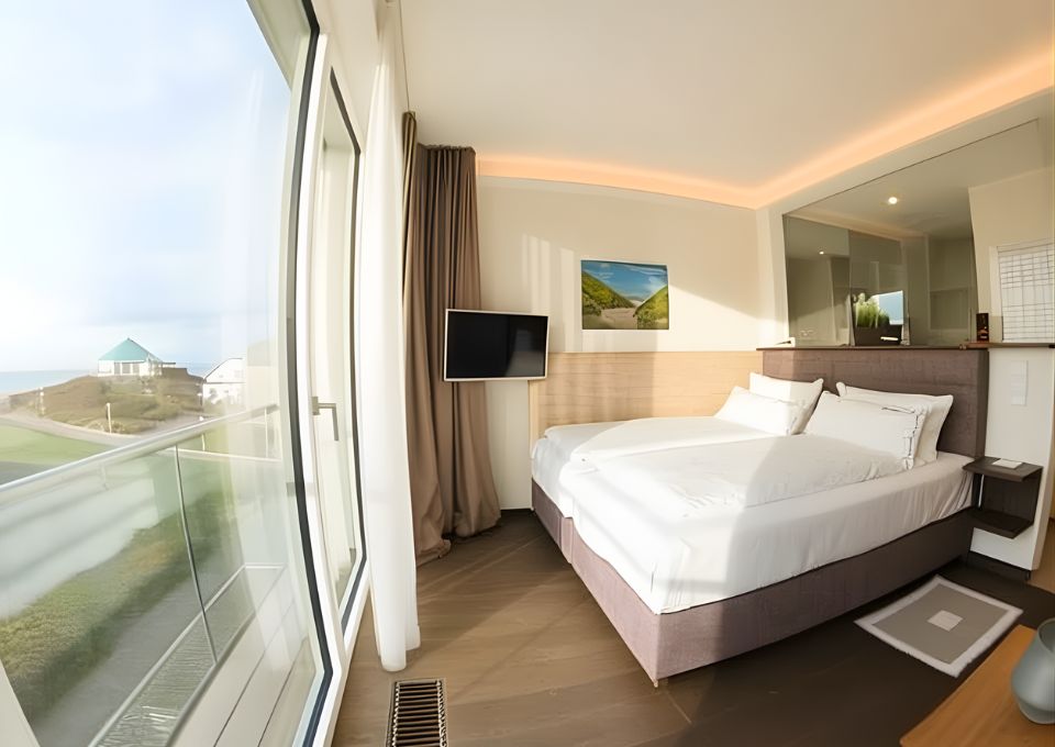 Appartement Juistblick 3 in der 3. Etage mit Französischen Steh-Balkon und Meerblick. Ausgestattet mit Kabel-TV, Pantryküche (ohne Kochmöglichkeit) mit Nespresso Kaffeemaschine und Wasserkocher, Wohn-Schlafbereich mit Boxspringbetten, offener Dusche und separaten WC